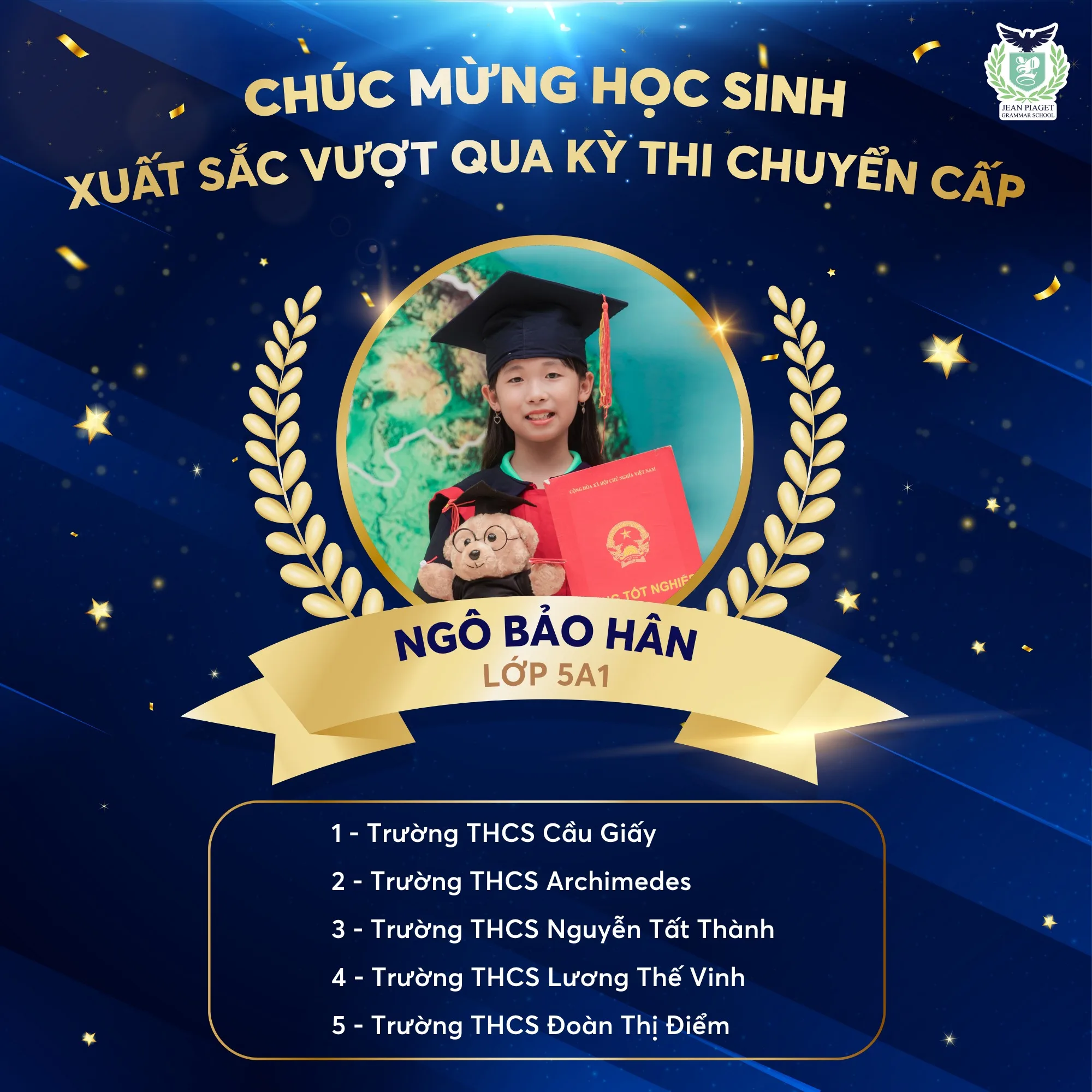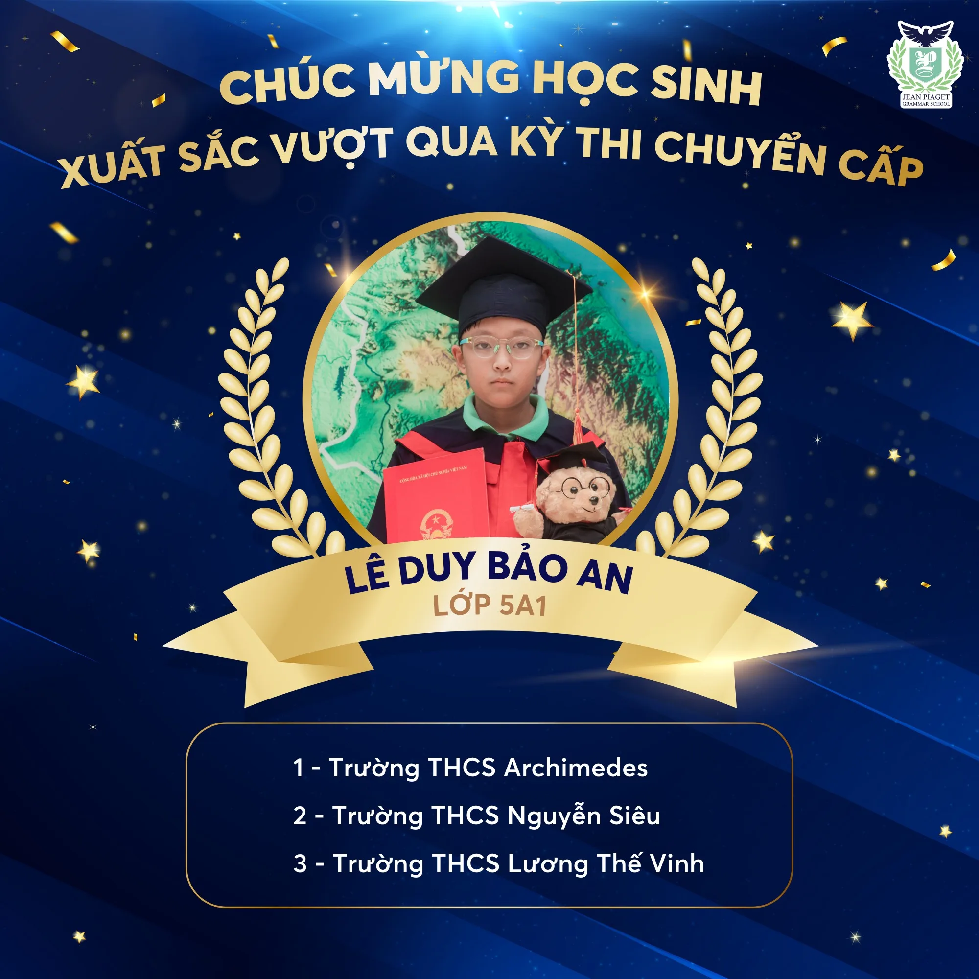 Những thành tựu học sinh Jean Piaget đạt được sau một cấp học là minh chứng cho hiệu quả của chương trình giáo dục toàn diện mà Jean Piaget kiên trì theo đuổi. Học sinh Jean Piaget không những được trang bị hành trang học thuật chắc chắn mà còn được nuôi dưỡng những phẩm chất và năng lực để tự tin, tự lập trong cuộc sống thực tiễn, sẵn sàng thích nghi và chinh phục những thử thách trong môi trường học tập mới.
